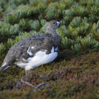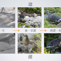 トップページ > 調査に参加する > 調査詳細 > 対象種詳細 対象種詳細 ライチョウ 分類 キジ目 キジ科 生きものの特徴 全長(くちばしの先から尾羽の先まで)は約35~37cmです。体の羽毛は年3回換羽します(写真2)。つがい形成から抱卵期(春・初夏)、雄の顔・首・体の上面の羽毛は黒褐色、雌は黒褐色、橙黄色、白色の斑模様です。雌雄とも冬期は白く、晩夏から秋は灰褐色です。翼(風切羽)は年1回換羽で白色です(写真1)。時々ライチョウとホシガラスを間違える人がいます。ホシガラスはよく飛びますが、ライチョウは滅多に飛びません。飛んだときにライチョウの翼は白いですが、ホシガラスのそれは白くありません。 分布 本州中部の飛騨山脈(北アルプス)、赤石山脈(南アルプス)、御岳、頸城山塊の高山帯に生息。木曽山脈(中央アルプス)や八ヶ岳、白山では絶滅。ただし、白山では2009年以降、北アルプス由来の雌1羽の生息が確認されています。世界最南端の集団であり、氷河期の遺存種として、隔離分布しています。 生息状況 1960年代から1980年代にかけて全生息域で実施された調査で、生息数は約3,000羽と推定された。近年、南アルプス北部などで生息数の急激な減少が報告され、絶滅が危惧されている。現在、環境省及び長野県レッドリストで絶滅危惧IB類。 生息環境 ライチョウが生息する環境は本州中部の高山帯です。年間を通して高山帯に生息しますが、厳冬期(1〜3月)は森林限界以下の亜高山帯上部まで下ります。繁殖期(5〜6月)には、背の低いハイマツがパッチ状に分布し、その周りにガンコウランなどツツジ科の矮性低木が優占する風衝地を好んで利用します(写真4)。母子連れの時期(7月〜)には、風衝地のほかお花畑の雪田植生も利用します。 高山帯の生物多様性の危機 かつて、高山帯ではオーバーユースや開発による高山植生の荒廃、ゴミやペットの持込にともなう汚染などが問題にされていました。現在,それらにくわえ、ニホンジカの採食による高山植生の変化や生態系への影響が問題となっています.特に、南アルプスでは深刻であり、北アルプスの高山帯でもニホンジカが確認されつつあります。また、気候変動による影響(ライチョウや高山植生等の生息適域の縮小)も一部の高山帯で顕在化しつつあります。 自分のなわばりに雄が侵入したのに気づき、その雄を追い出すために鳴きながら飛び立った成鳥雄。 季節によって異なるライチョウの羽色 4羽のヒナをあたためる成鳥雌と孵化後間もないヒナ1羽。 ハイマツのまわりにあるガンコウランとそこで採食する成鳥雄 もどる