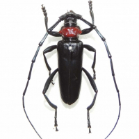 トップページ > 調査に参加する > 調査詳細 > 対象種詳細 対象種詳細 クビアカツヤカミキリ 分類 生きものの特徴 ●カミキリムシ科ジャコウカミキリ属 ●学名は、Aromia bungii (アロミア・ブンギ) ●特定外来生物に指定(平成30(2018)年1月) 分布 自然分布は、中国、モンゴル、朝鮮半島、台湾、ベトナム。 形態 ●成虫の体長は25-40mm程度。 ●成虫の前胸背板は明赤色で他は光沢のある黒色。前胸背板の側面に頑丈なとげ状の瘤を一対持つ。 ●触角は黒色で、オスの触角は体長より長く、メスの触角は体長よりも短い。 生態 ●自然分布は、中国、モンゴル、朝鮮半島、台湾、ベトナム。 ●サクラ、ウメ、モモ、スモモ等の主にバラ科の樹木を加害する。 ●幼虫は、樹木の生木(辺材や心材)を摂食し、フラス(フンと木屑が混ざったも)を排出しながら、樹体内で2~3年かけて成長し蛹となる。 ●幼虫の活動期は春から秋にかけてであり、この間にフラスが排出される。 ●蛹は6月中旬から8月上旬に成虫となり、樹体の外に出る。 ●メスの成虫は交尾後、幹や主枝の樹皮の割れ目に産卵する(8~9日後に孵化する)。 1頭あたり1000個近く産むこともある。 ●成虫の寿命は2週間以上。成虫越冬はしない。 国内及び県内への侵入状況 ●国内の最も古い記録は、2011年埼玉県深谷市の成虫の記録。 ●2012年に愛知県、2013年に埼玉県草加市、2015年に群馬県、東京都、大阪府、徳島県、2016年に栃木県で被害が発生。 クビアカツヤカミキリオス成虫 クビアカツヤカミキリ幼虫 もどる