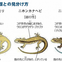 トップページ > 調査に参加する > 調査詳細 > 対象種詳細 対象種詳細 ニホンヤモリ 分類 有鱗目 ヤモリ科 生きものの特徴 夜に民家や街角の明かりに集まる虫を捕(と)って食べる夜行性(やこうせい)の爬虫類(はちゅうるい)。壁(かべ)によじ登る姿(すがた)から「カベチョロ」と呼(よ)ぶ地域(ちいき)もあります。大きさは10~14cmほどで、灰(はい)色や暗い黄土(おうど)色をしています。指の先が丸い形をしており、指の腹(はら)にフックのような細かい毛がついているため(肉眼(にくがん)では毛は見えません)、壁やガラスにくっつくことができます。 分布 本州・四国・九州 見られる場所の目安 民家の壁・街角の明かりの下 見られる季節の目安 春~秋 似ている種類との見分け方 ニホンカナヘビとニホントカゲに似(に)ています。 この2種は昼行性で、ニホンヤモリは夜行性なので、夜に姿(すがた)を見たらほぼニホンヤモリと言って間違(まちが)いありません。 ニホンヤモリは背中(せなか)に茶色い模様(もよう)が付くことがありますが、あまり目立ちません。ニホンカナヘビとニホントカゲはコゲ茶色と白色の縦(たて)じまがあります。ニホンヤモリは指の先が丸い形をしていますが、ニホンカナヘビとニホントカゲは指の先に爪(つめ)があるのでとがっています。ちなみに、ニホンカナヘビはウロコがザラザラ・ゴツゴツしていますが、ニホントカゲはウロコがスベスベでやわらかい感じがします。また、ニホントカゲの子どもの尾(お)はメタリックブルーに輝(かがや)いています。 なるほどコラム ニホンヤモリは、家の周りの害虫を食べるため、漢字で「家守」や「守宮」と書かれるなど、家を守る縁起(えんぎ)の良い生きものとして、古くから親しまれています。 ニホンヤモリ 似ている種類との見分け方 もどる